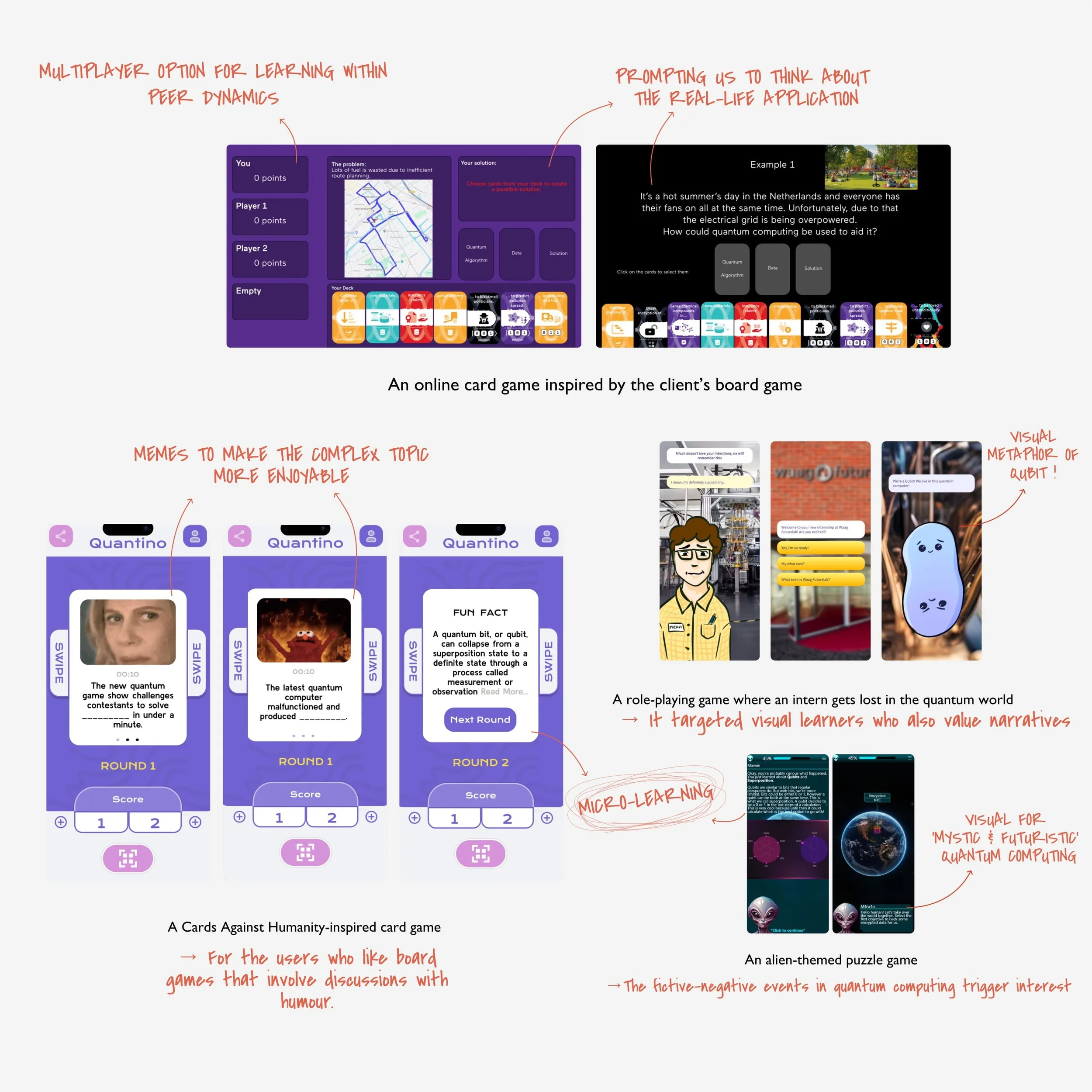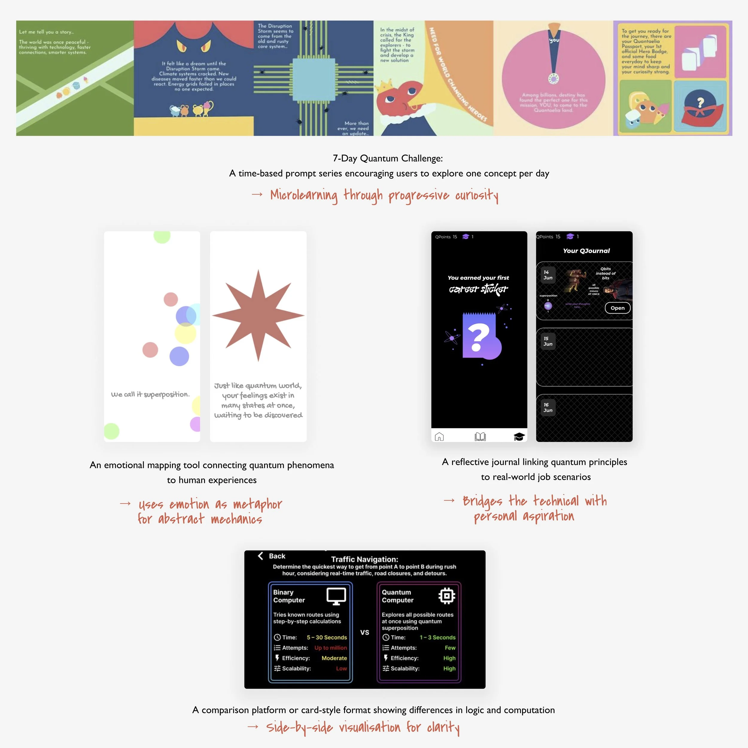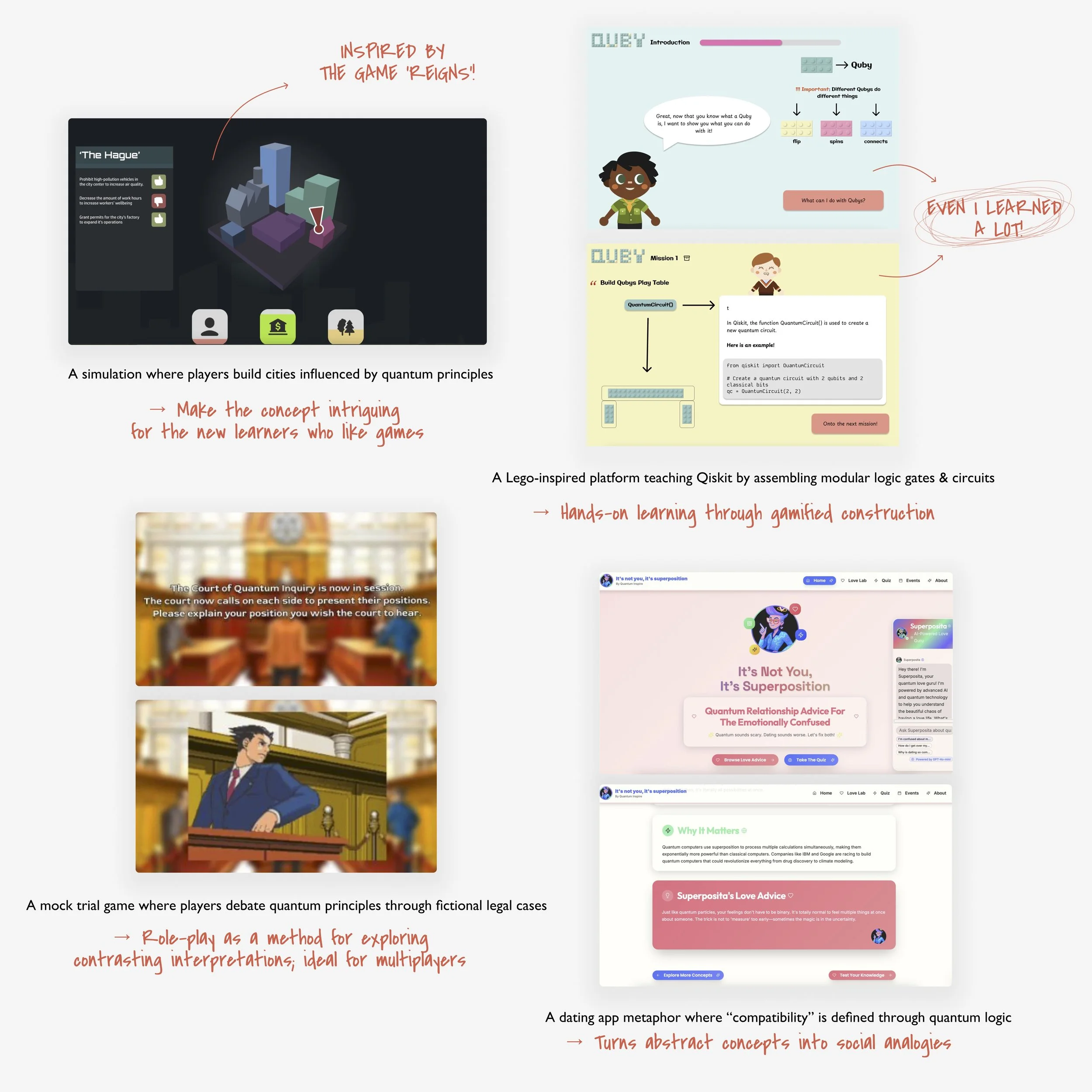 Designs shifted away from static definitions toward feelings, perspective-taking, and lived decision-making. Users played as judges, gamblers, students, or citizens; understanding quantum ideas by becoming characters themselves.→ For this direction: