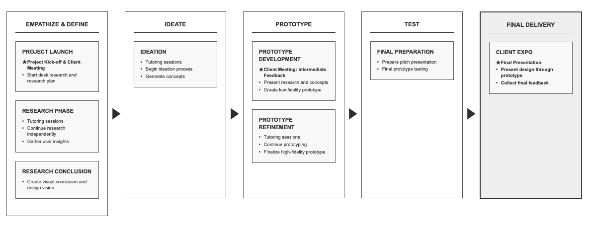 After the research phase, the students were guided to conduct 2 rounds of mid-stage testing, leading to 2–3 prototype iterations based on feedback. 10 outcomes were created.
